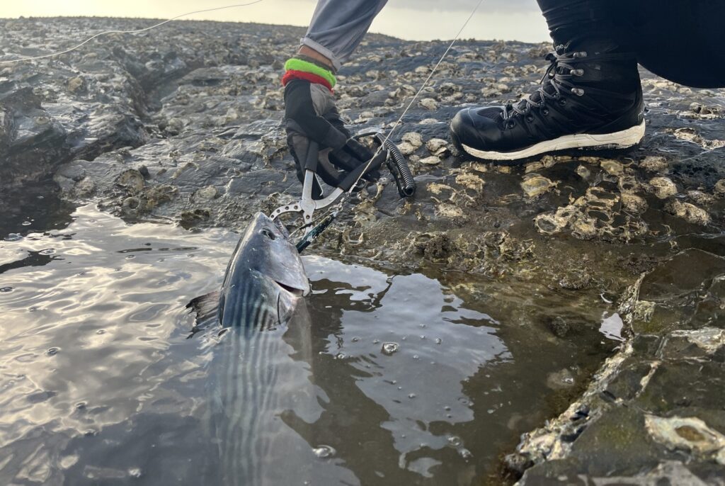 ここでは、そこまでサラシが広がらず、睡眠不足が今頃にやってきたこともあって小休止していたところ、ジグを投げていた友人Kがハガツオをキャッチ・・。