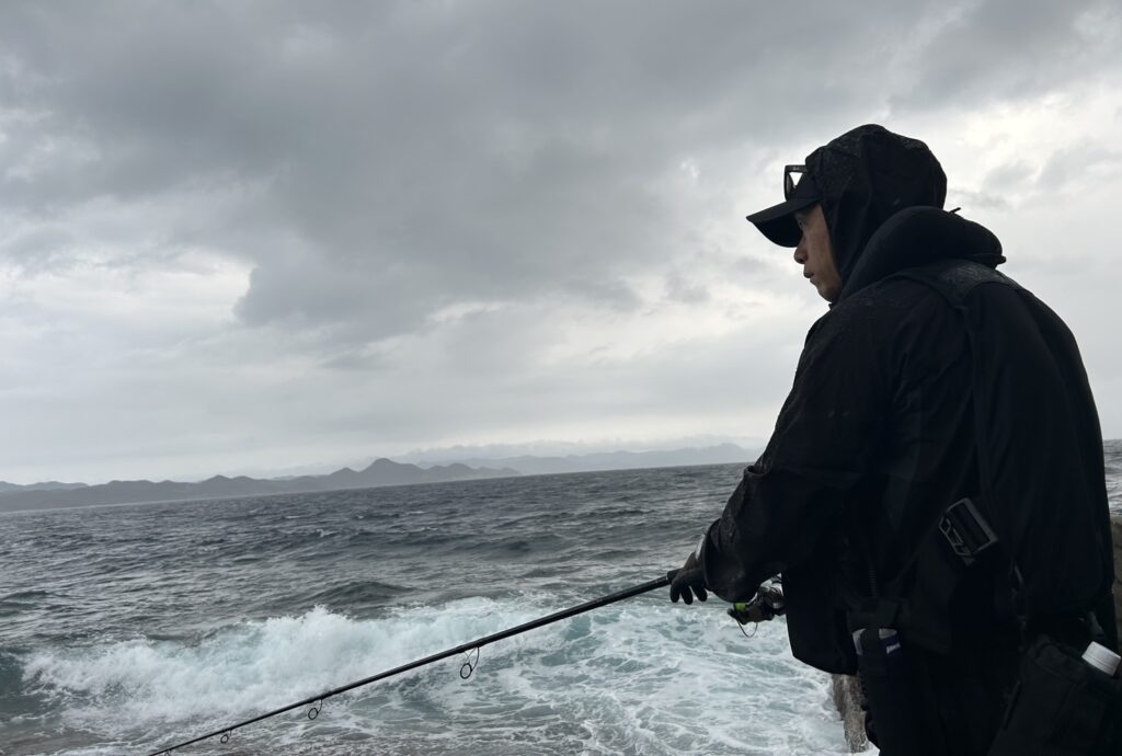 我々は、小雨降る状況で爆風の磯でヒラスズキを狙う・・。