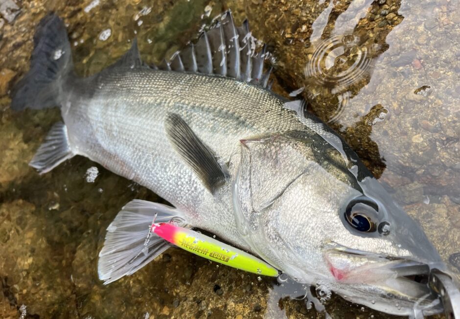 普段なら届かない沖のサラシを横切るようなアプローチでヒラセイゴを3尾キャッチして終了・・。