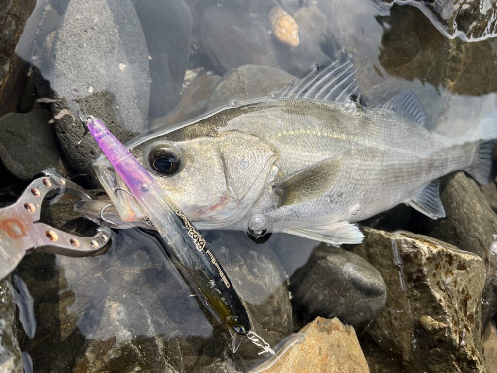 先行の権利を充分に果たすことが出来ず、アプローチを再構築する必要が出たので、REGLIA100LTでスローなアプローチの模索に入ろうとしていたタイミングでブートキャンプの主催者がヒラスズキのキャッチに成功する。