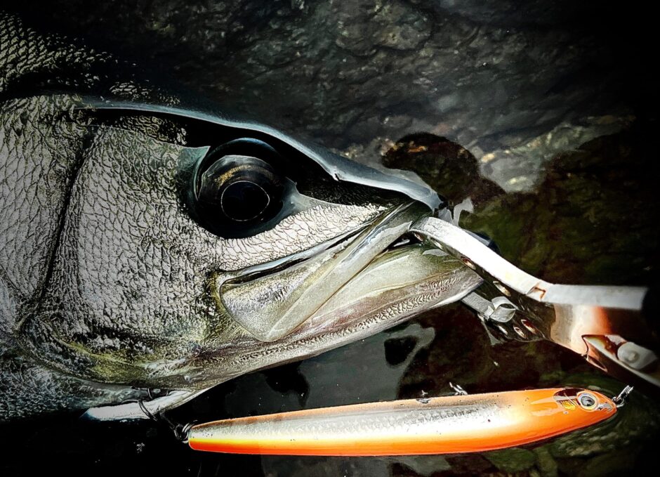 瀬と瀬の間のサラシの払い出しの奥に入れて、水を噛ませて払い出しに突入させた瞬間に横から掻っ攫うように水面から飛び出したのはサイズの割に究極にグラマラスボディなヒラスズキ・・。